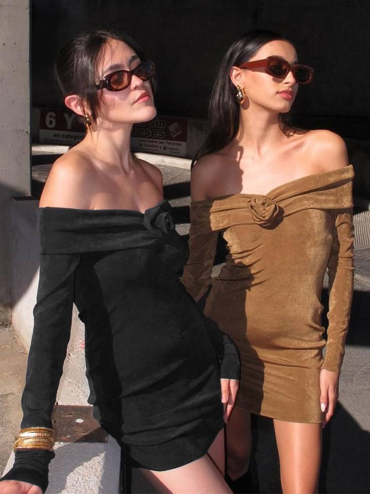 欧美女装外贸新款性感露肩一字领拼接手工花绒面纯御风包臀连衣裙