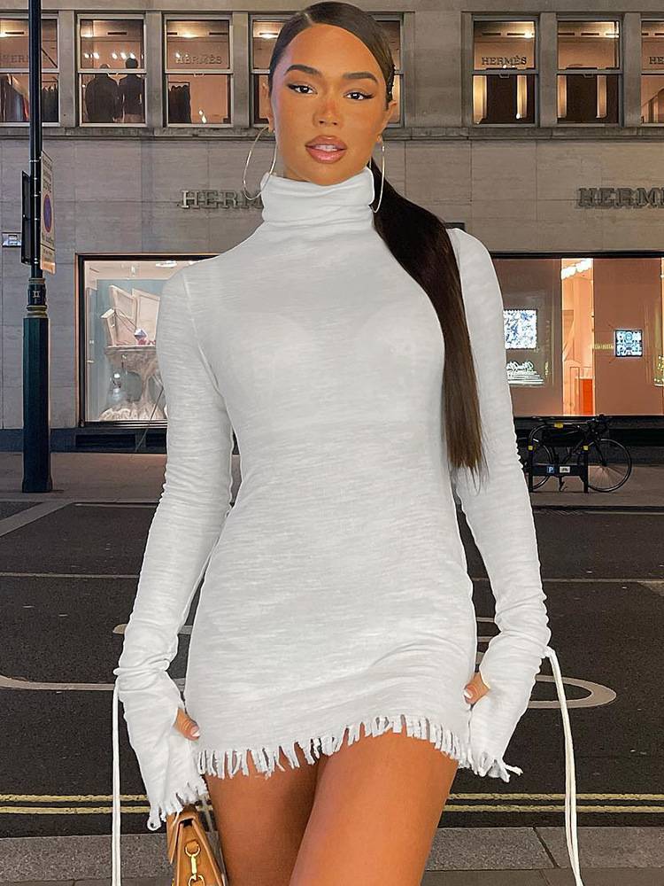 亚马逊跨境冬季新款时尚高领修身长袖街头风性感碎边短款连衣裙女