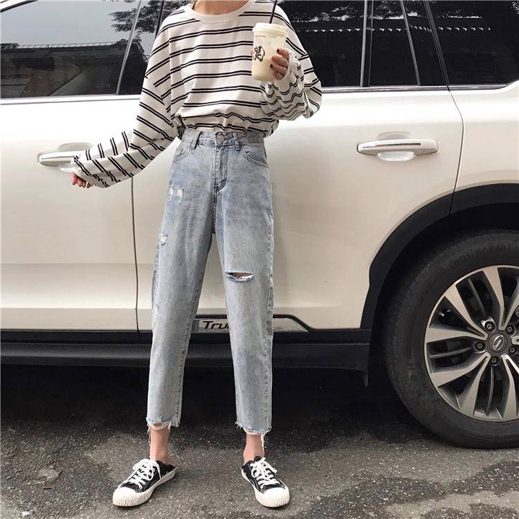 2019新款古着牛仔裤女宽松韩版学生显瘦破洞牛仔裤子女高腰九分裤