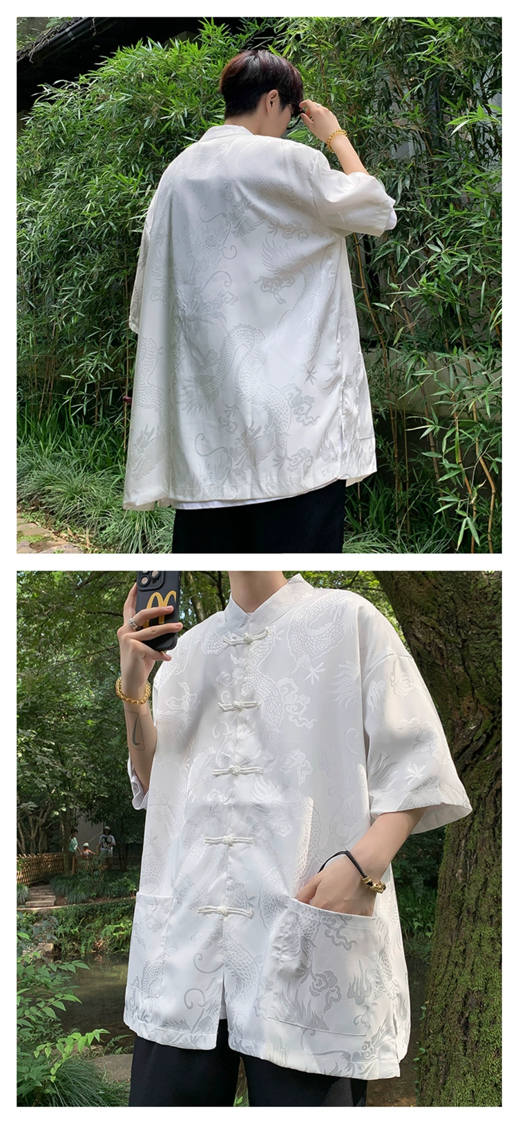 夏季中国风唐装短袖衬衫男港风休闲盘扣提花设计感宽松五分袖衬衣