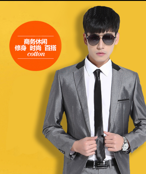 西服套装男士银灰色修身亮面休闲小西装男职业装新郎结婚伴郎礼服