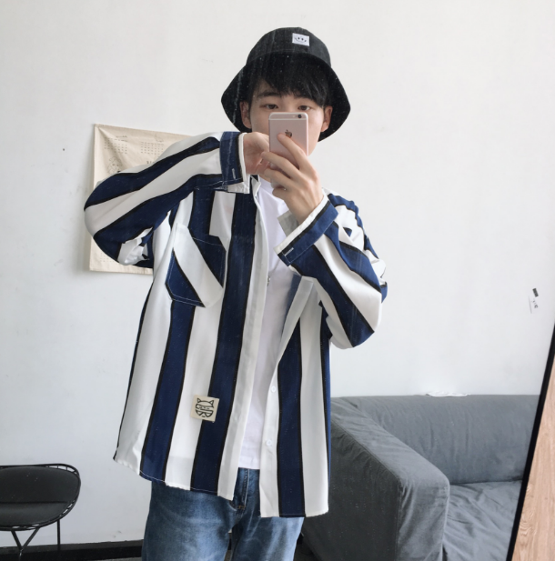 夏季大码男条纹衬衫男士港风休闲ins长袖衬衣韩版防晒衣潮寸衫
