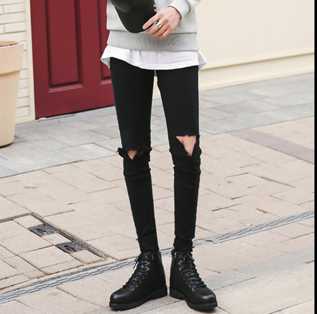 个性修身男生乞丐三角破洞裤小脚牛仔裤韩版紧身弹力潮流长裤夏季