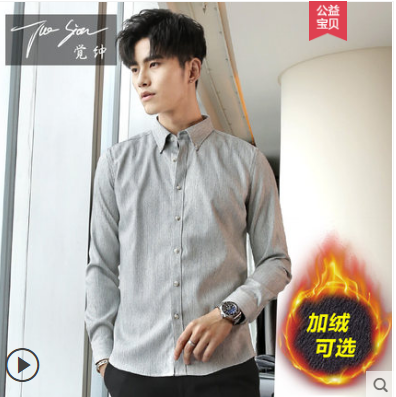 男士衬衣2018秋冬寸衣潮流休闲加厚加绒保暖韩版修身条纹长袖衬衫