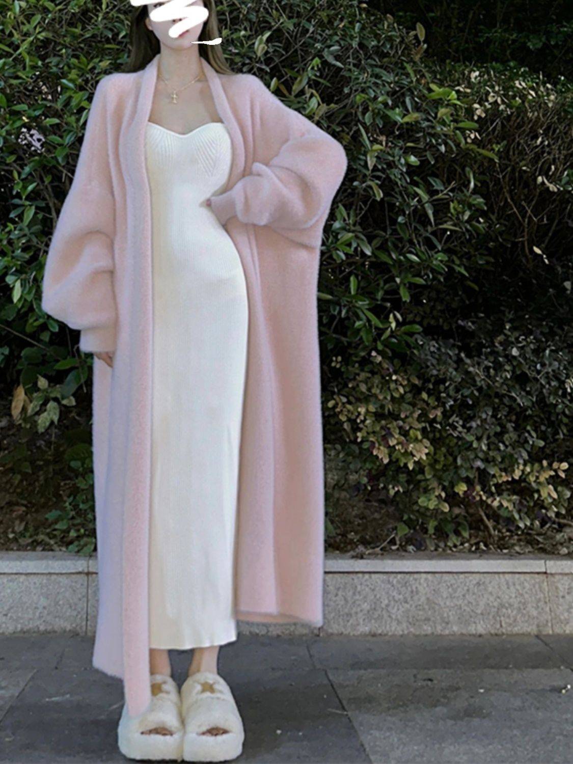蕾朵粉色奶fufu水貂绒毛衣外套开衫女秋冬慵懒风中长款针织衫加厚