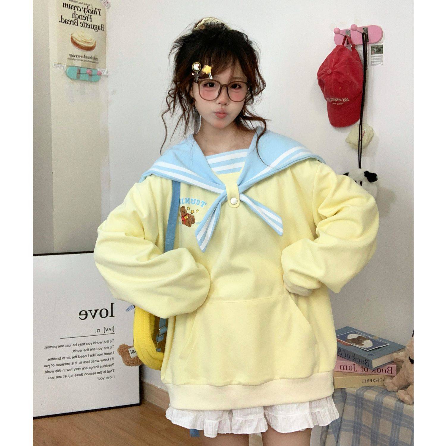 送小熊海军领可爱连帽卫衣女学生秋冬季加绒加厚宽松甜美长袖外套