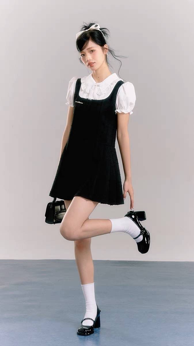 EROLLSURE原创泡泡袖小香风假两件连衣裙女显瘦淑女衬衫百褶裙子