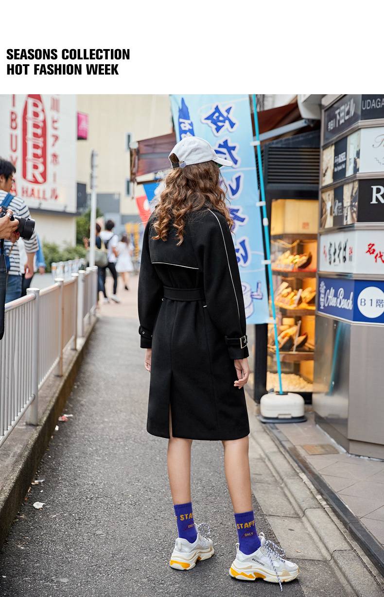 黑色毛呢外套女中长款韩版2018新款系带收腰冬季外套双排扣呢大衣 699.00 已售:0件