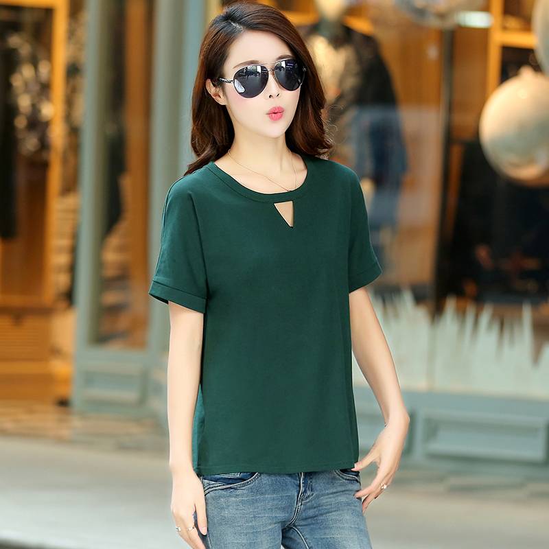 2019新款韩版夏季短袖t恤女打底衫宽松圆v领简约女装体恤时尚上衣