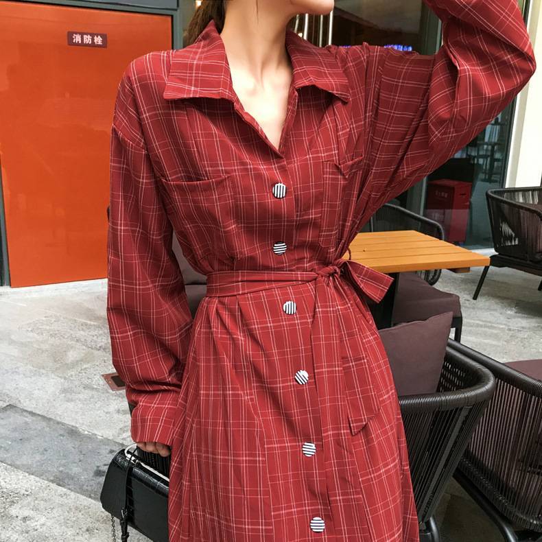 秋季外套女2019新款ins复古格子翻领系带收腰宽松过膝长款风衣 120.00 已售:0件