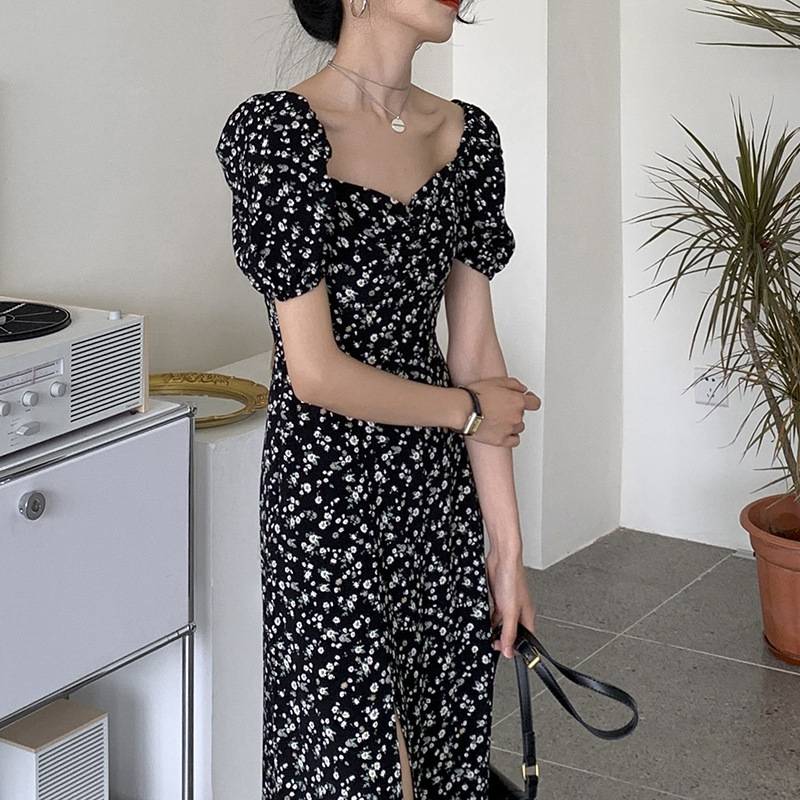网红2021夏季新款法式方领碎花连衣裙女黑色设计感茶歇裙长款裙子