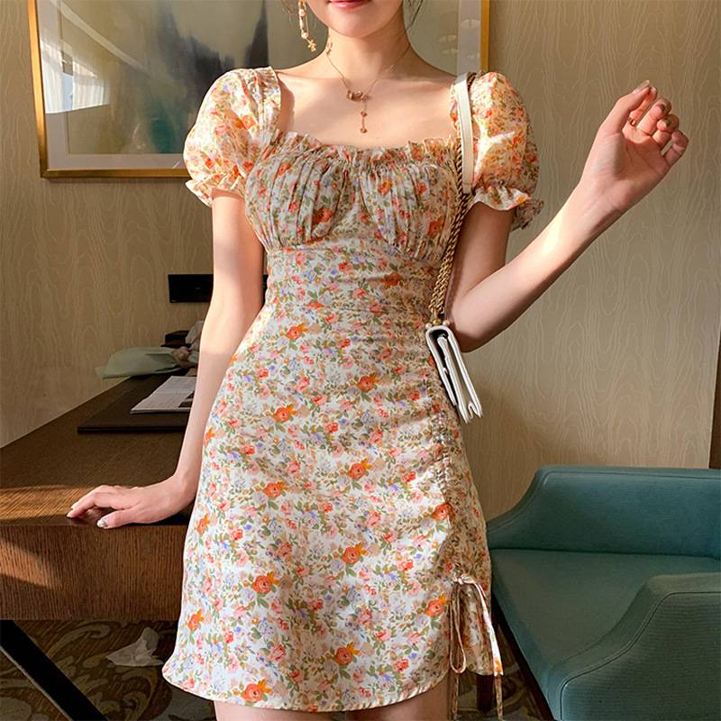 女装 夏季2022新款网红连衣裙性感方领花边印花爆款裙子