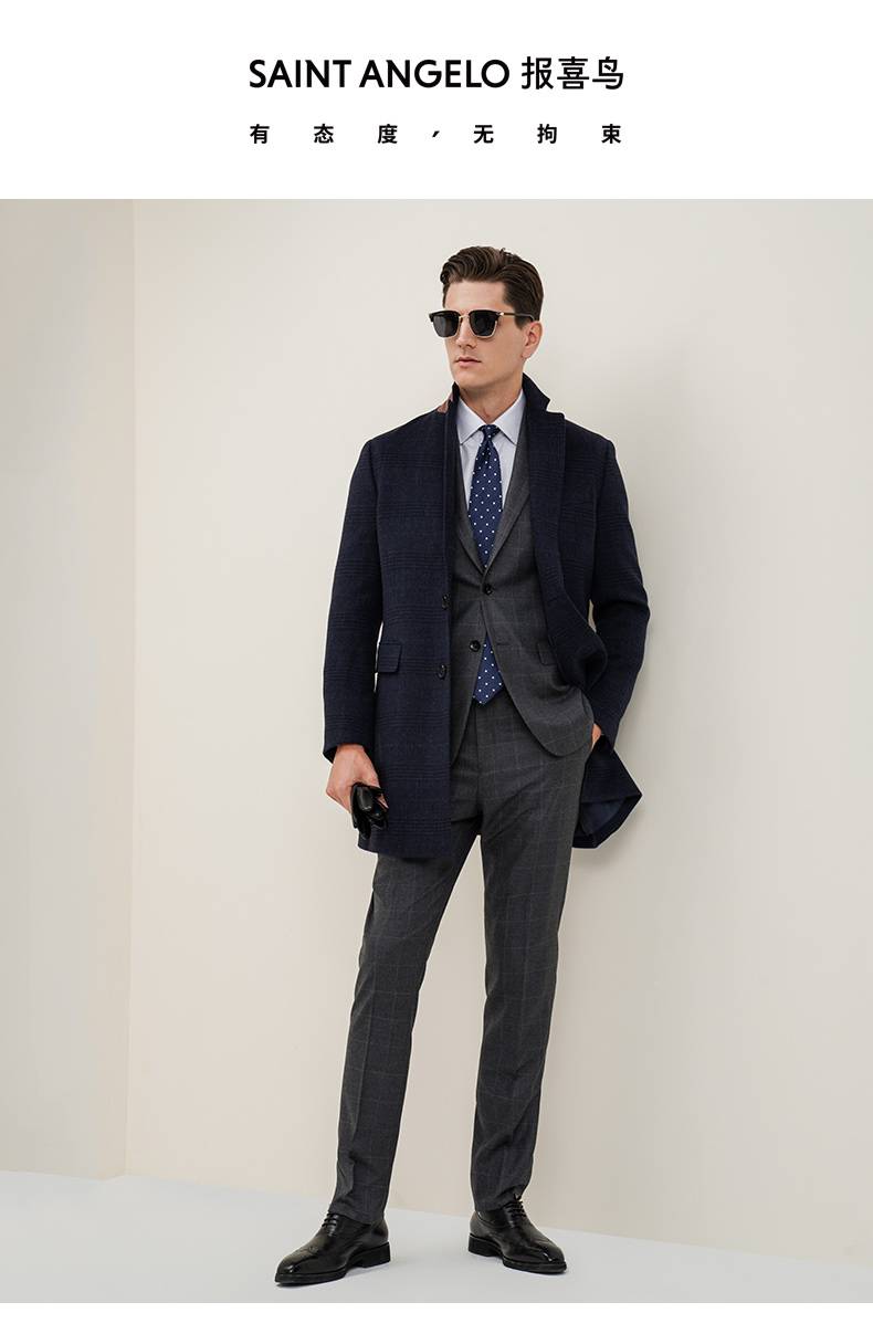 报喜鸟冬季男士商务休闲羊毛大衣 格纹长款西装领保暖羊绒外套男