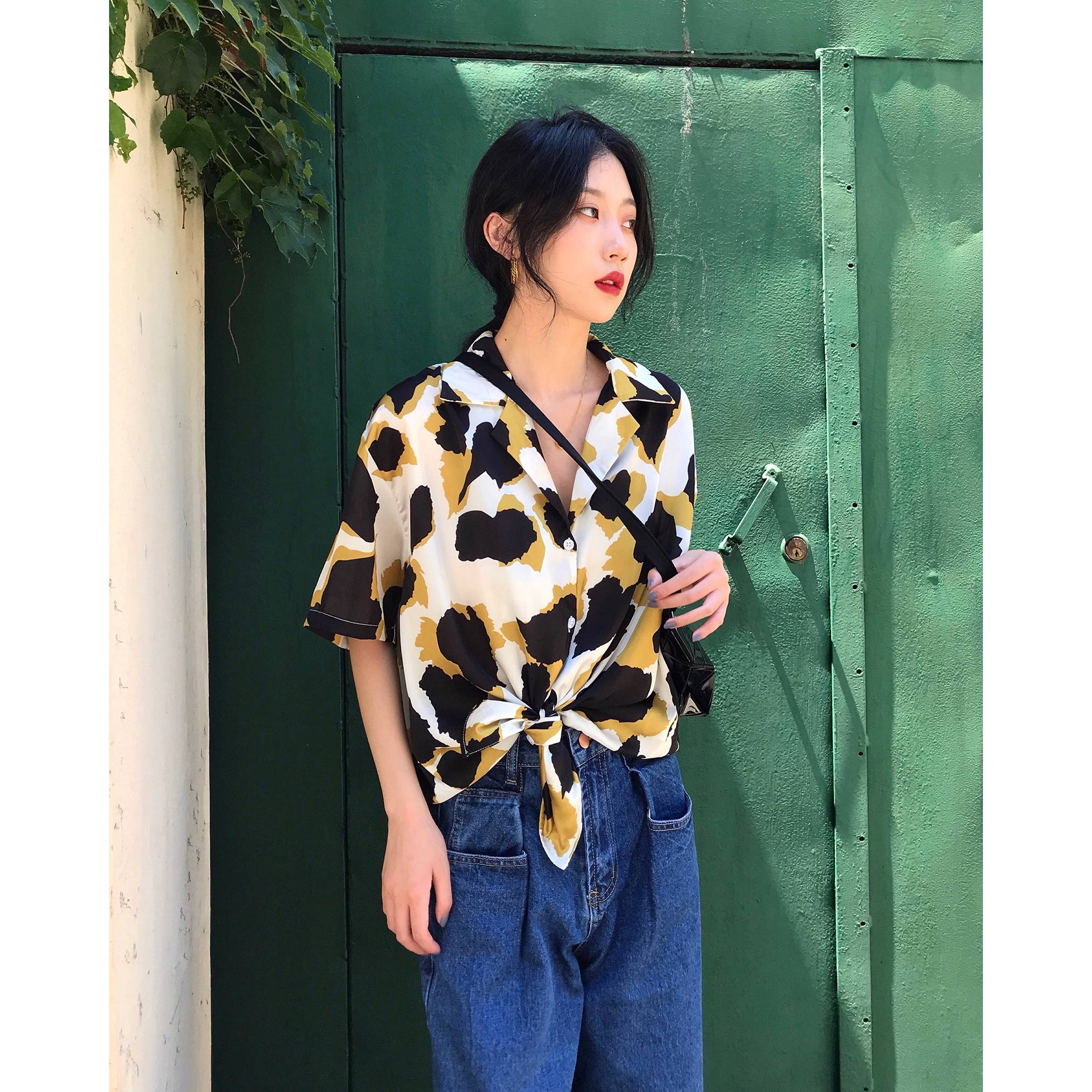 2018夏季新款五分袖V领印花薄款上衣女复古宽松半袖衬衫女