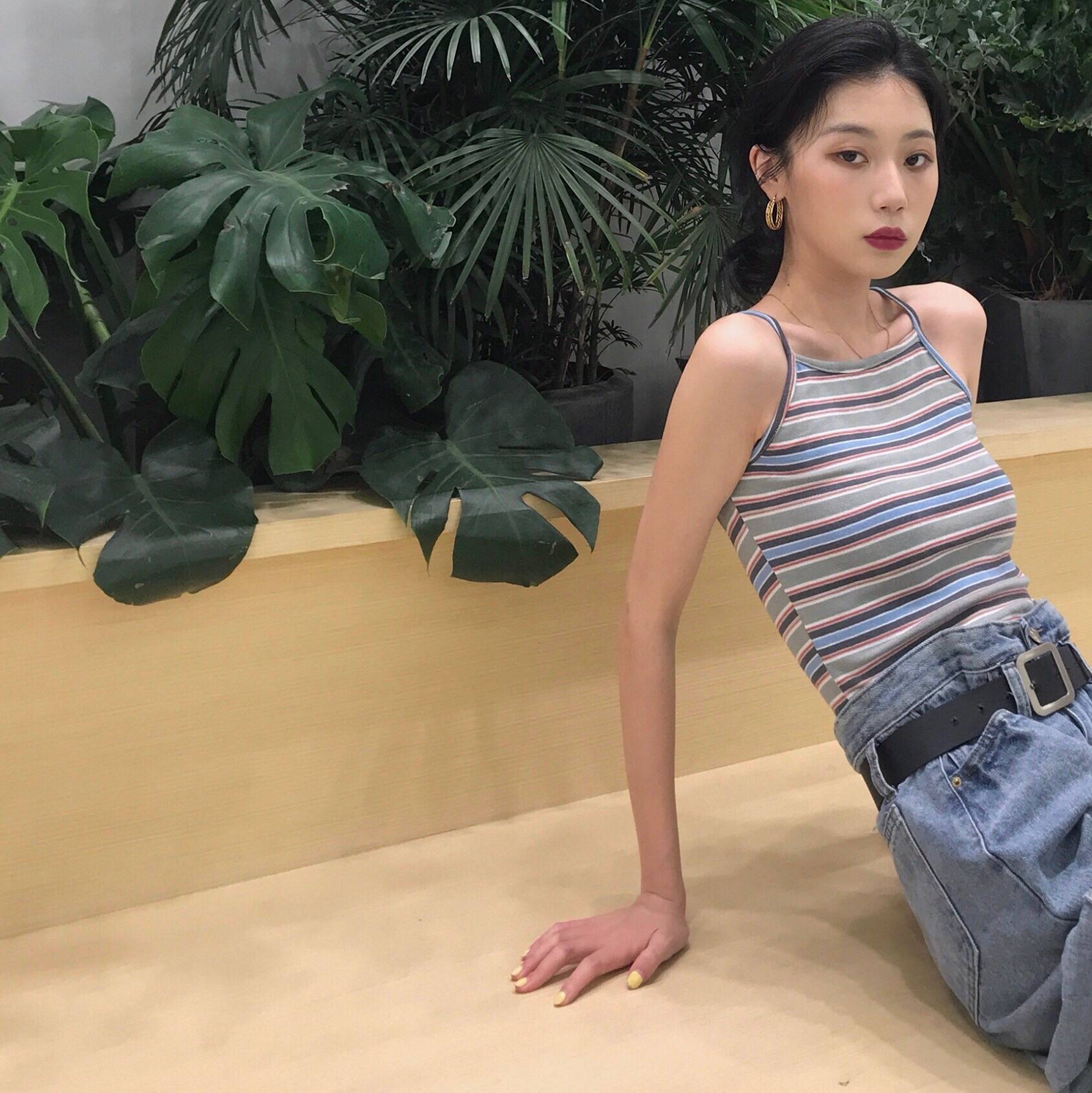 2018夏季新款条纹针织背心无袖短款修身打底衫女露肩上衣