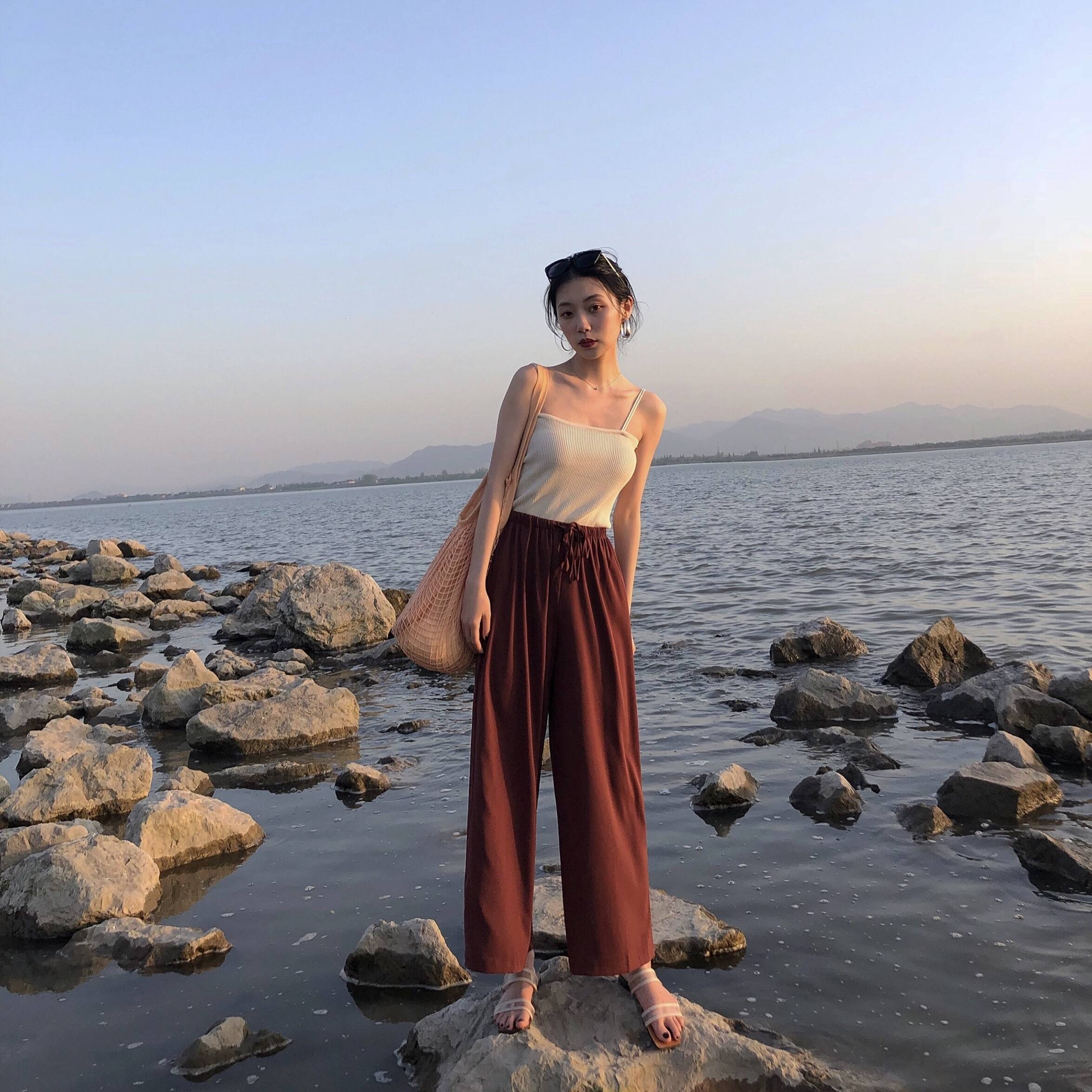 2018夏季新款复古宽松口袋雪纺阔腿裤高腰修身显瘦百搭九分裤子女