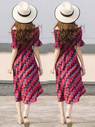一字肩连衣裙女2018夏季新款韩版显瘦收腰冷淡风红色复古初恋长裙 126.00 已售:0件