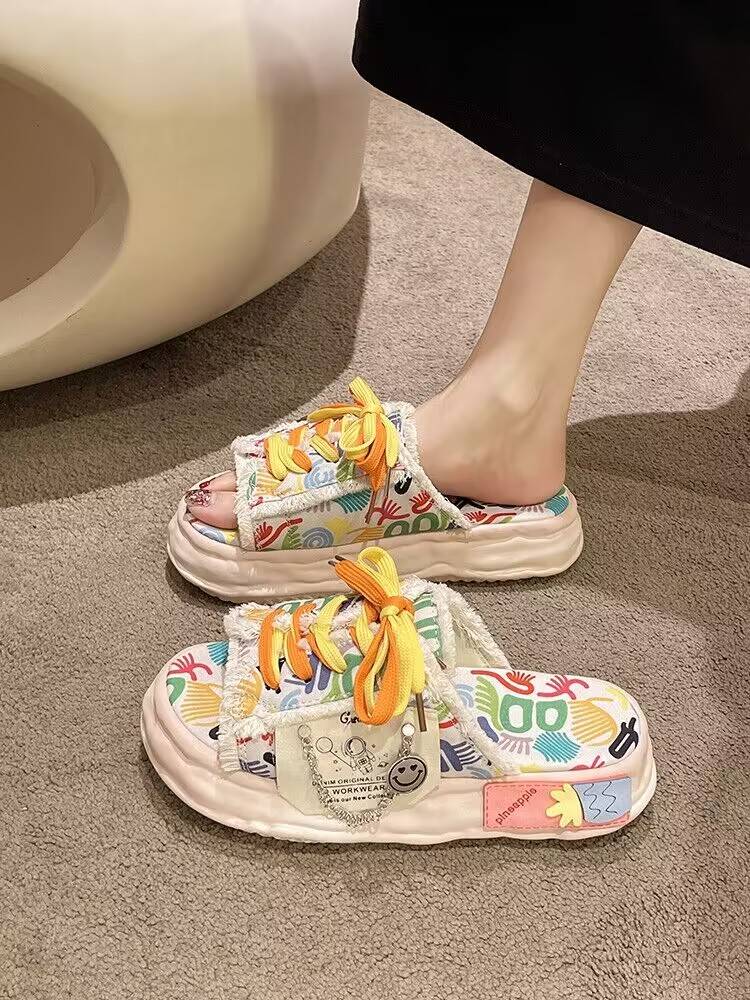 可爱涂鸦厚底拖鞋女夏季外穿2022年新款设计感小众踩屎感沙滩凉拖
