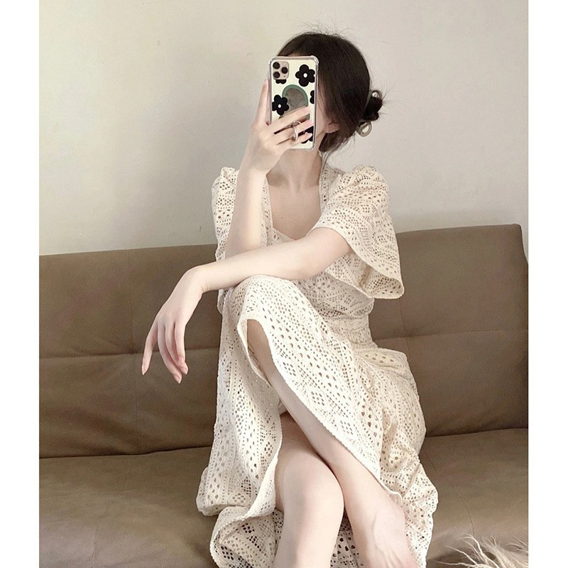法式气质镂空蕾丝连衣裙子2024新款夏季御姐轻熟风显瘦方领长裙