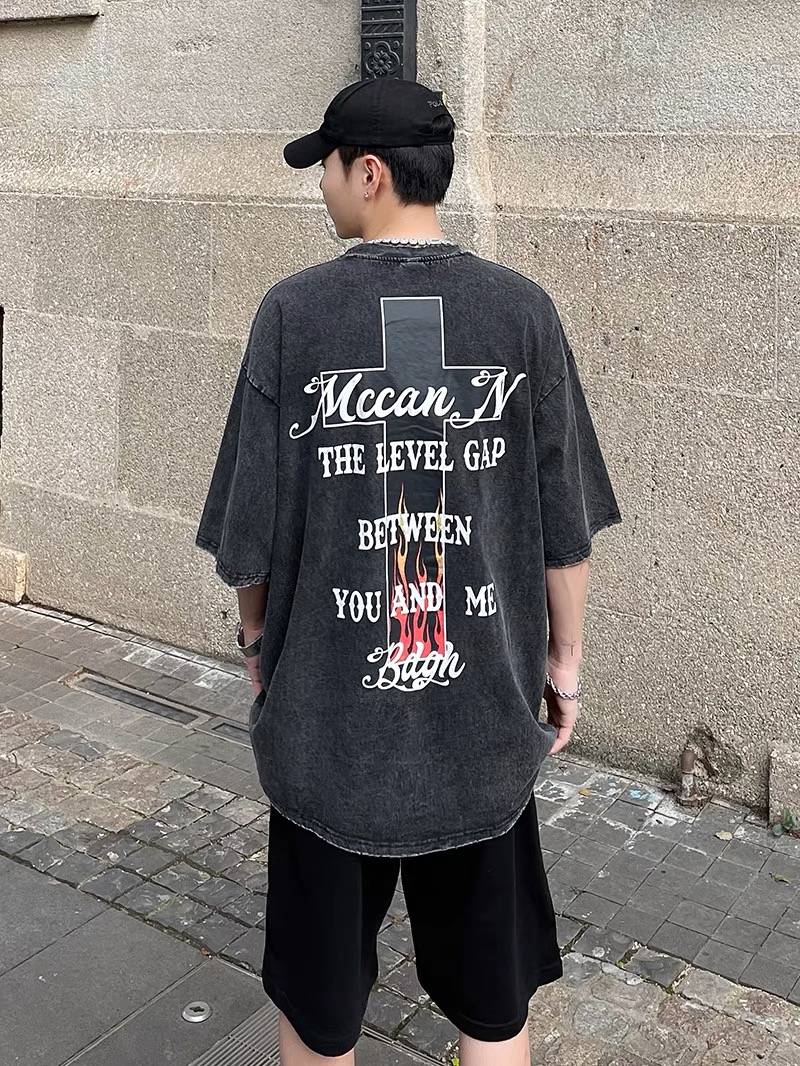 美式街头复古国潮十字架印花水洗做旧短袖T恤男ins潮牌高街上衣夏