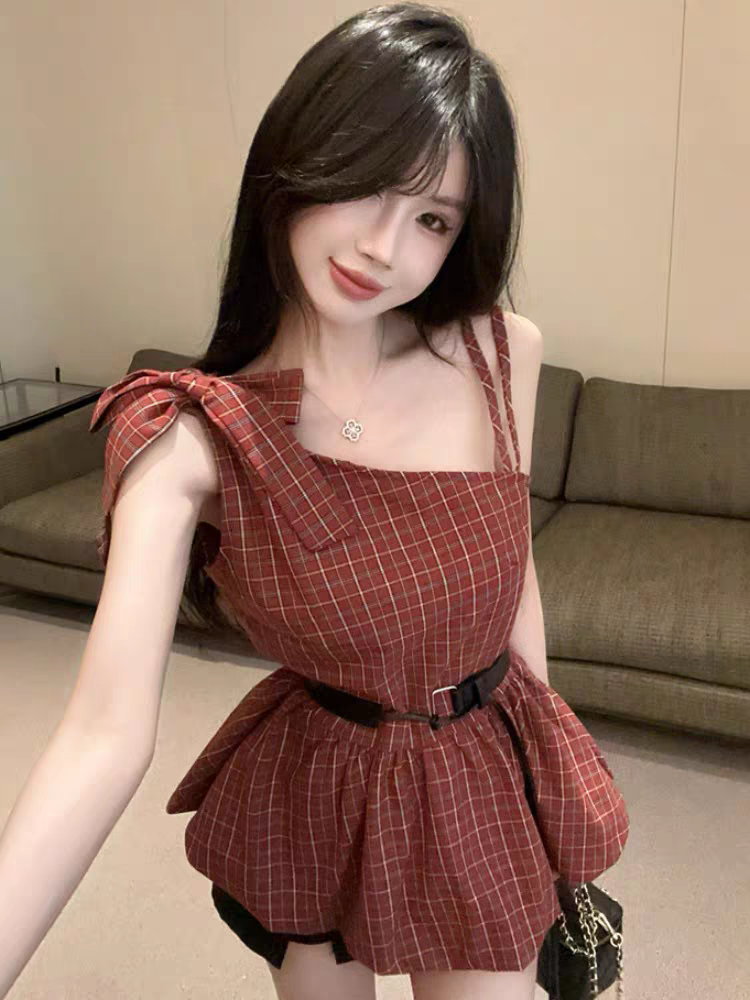 夏季设计感绑带露肩格子吊带背心女洋气纯欲风辣妹配腰带小衫上衣