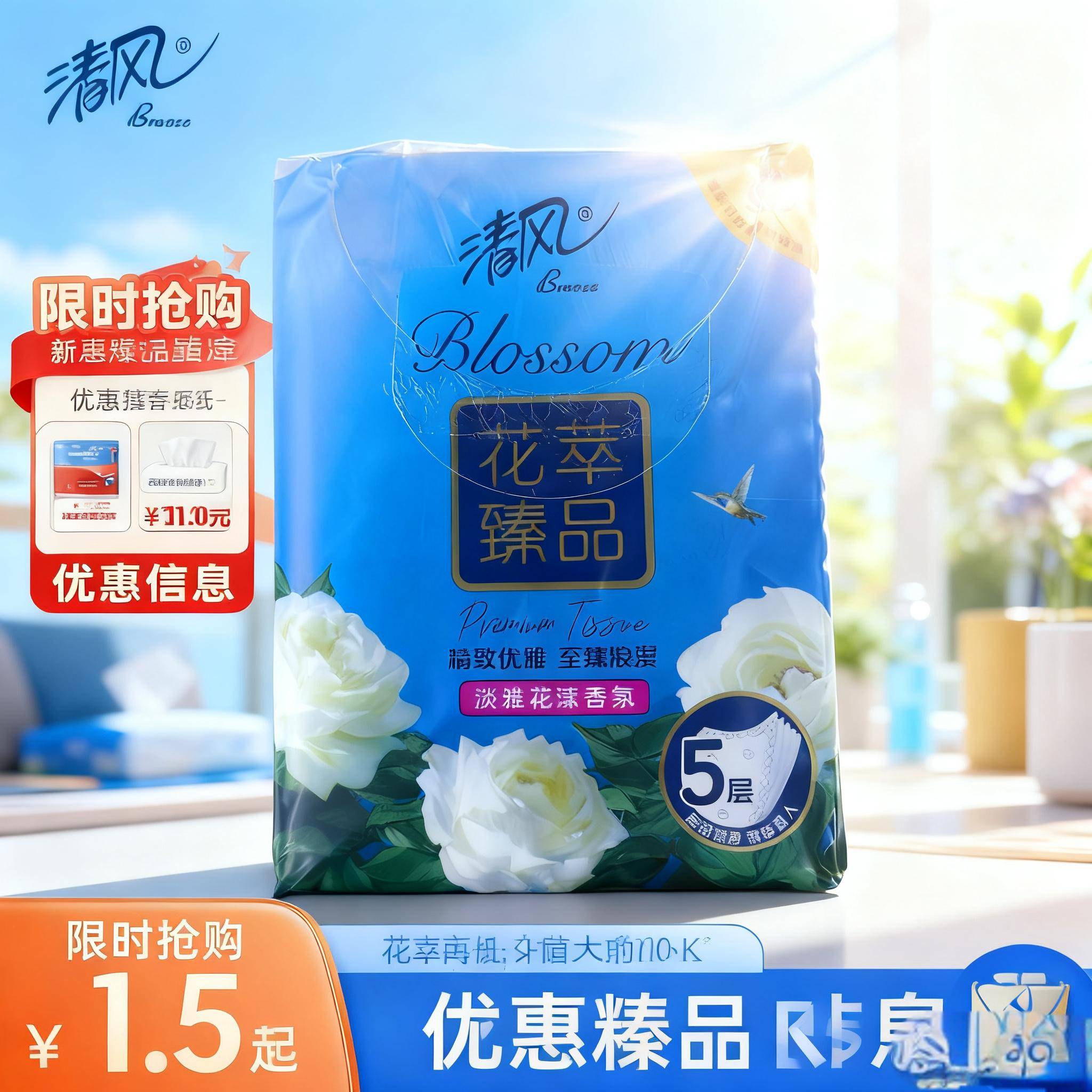 【直播专属】清风花萃臻品香氛纸巾,5层质感1.5元起限时抢,精致生活必备! 15.00 已售:0件