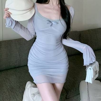 纯欲网纱连衣裙女新款法式收腰显瘦紧身长袖包臀短裙