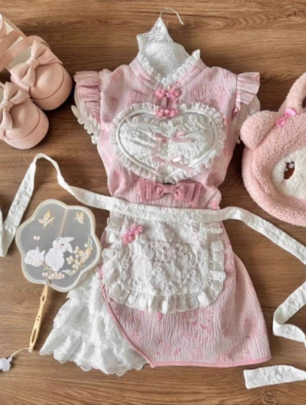 中华小甜娘新中式改良版旗袍提花爱心镂空粉色连衣裙女仆围裙套装