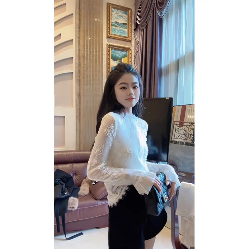 2023秋冬新款毛衣针织衫蕾丝上衣内搭打底衫别致爆款白色小衫女装