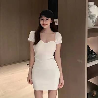 温柔风连衣裙女夏季性感一字领露肩针织裙子法式白色针织包臀裙潮