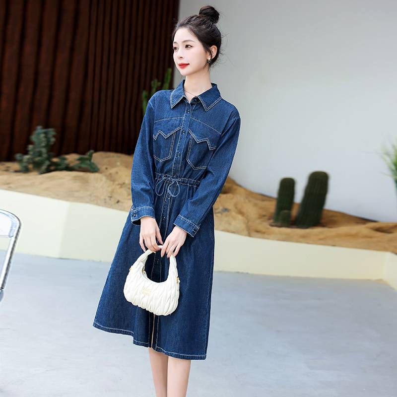 牛仔连衣裙女春秋2023新款中长款收腰显瘦法式高级感学院风衬衫裙
