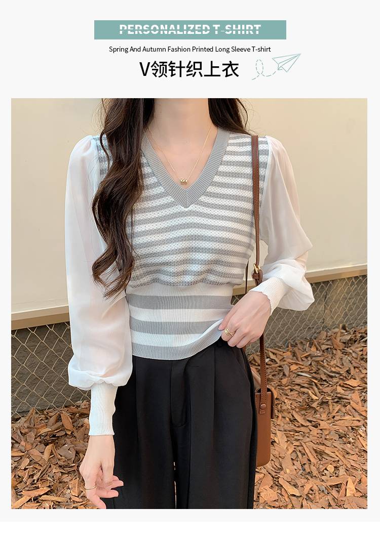 实拍 条纹针织衫v领长袖T恤打底衫设计感拼接灯笼袖薄款春秋上衣