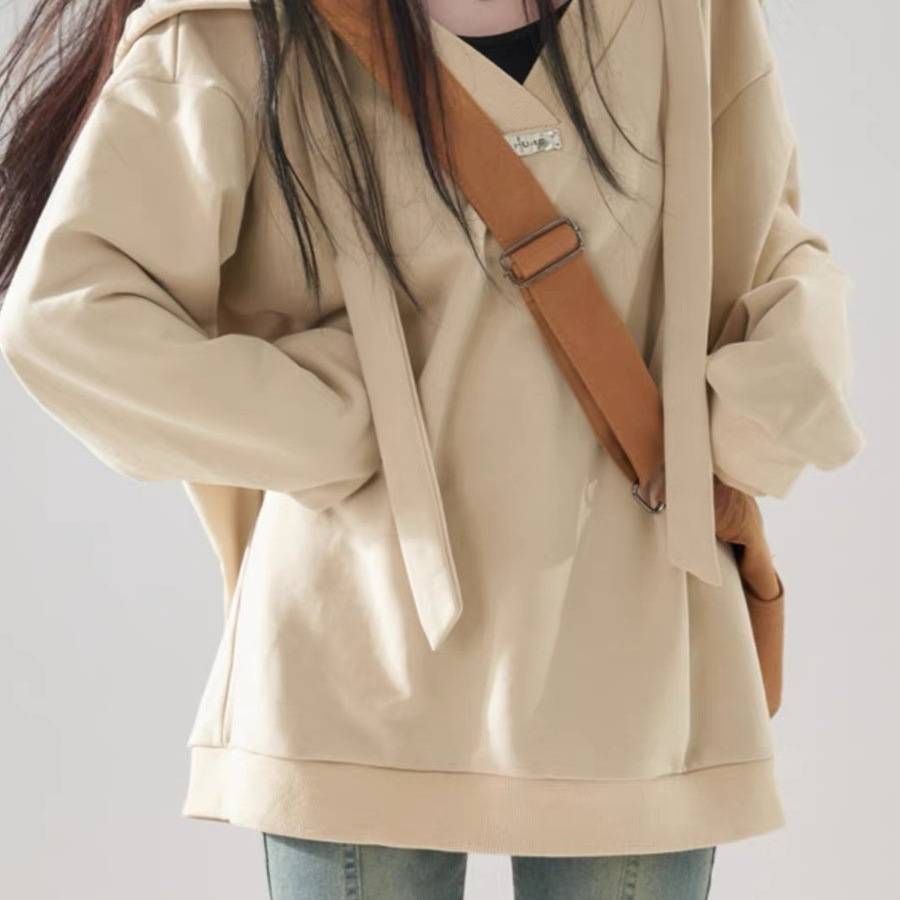 大码胖mm美式慵懒风休闲卡其色卫衣女秋季新款宽松假两件连帽卫衣