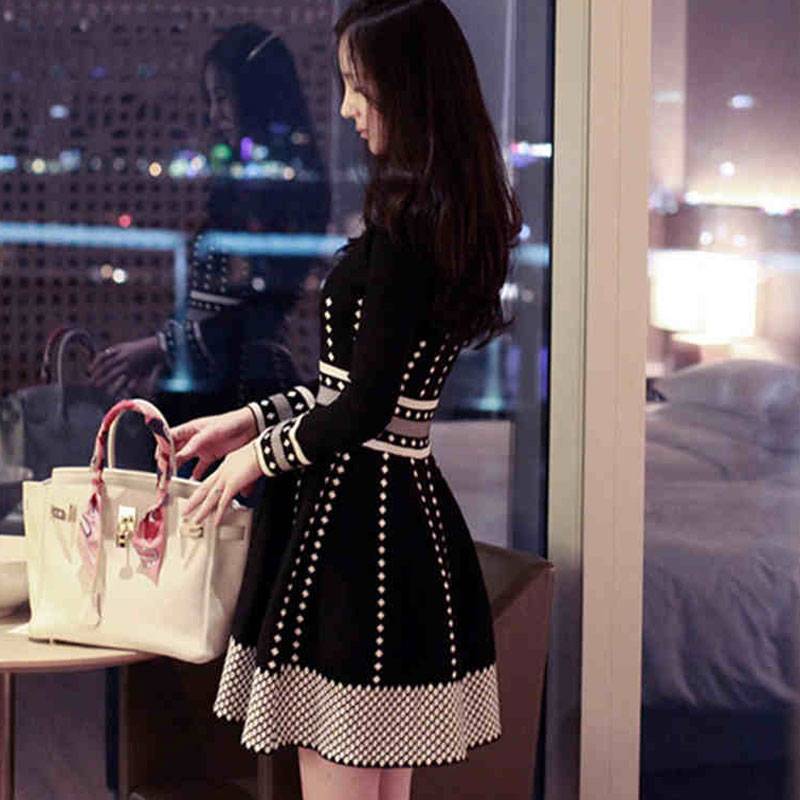 复古冷淡风秋季长袖2018新款修身小香风a字裙女中长款针织连衣裙