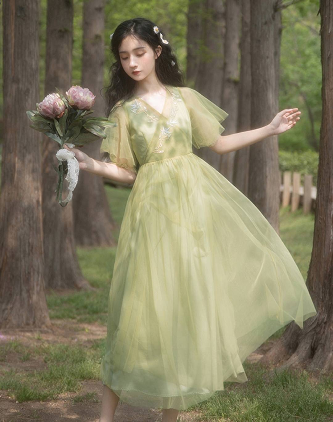 法国小众桔梗裙子女2020夏装新款气质V领单排扣雪纺短袖连衣裙女