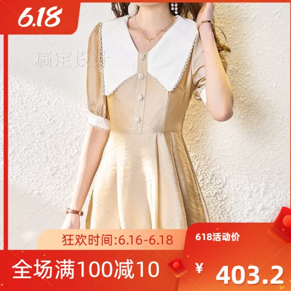欧货时尚洋气娃娃领连衣裙女2021年夏季新款 气质收腰泡泡袖a字裙