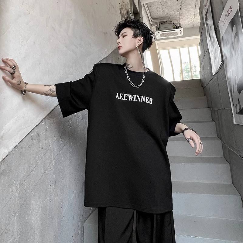 夏季ins暗黑系痞帅垫肩短袖T恤男小众字母印花韩版纯棉百搭半袖t