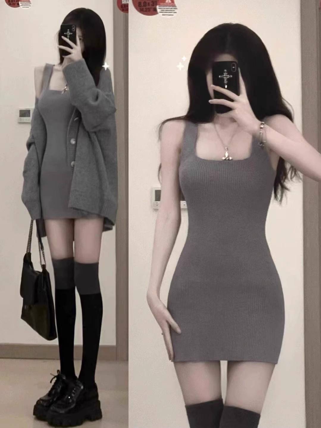 气质高级感韩版针织吊带裙女秋冬款纯欲高冷御姐风包臀连衣裙套装