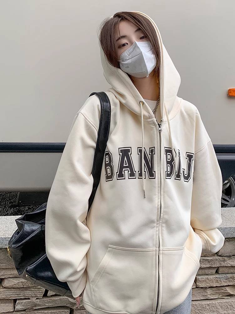 拉链连帽外套女春季新款简约字母刺绣宽松大码纯色开衫卫衣女上衣