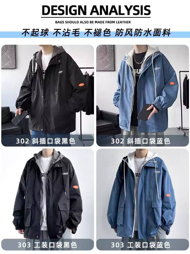 青少年假两件外套男款秋冬季新款棉服潮牌宽松大码工装冲锋衣夹克