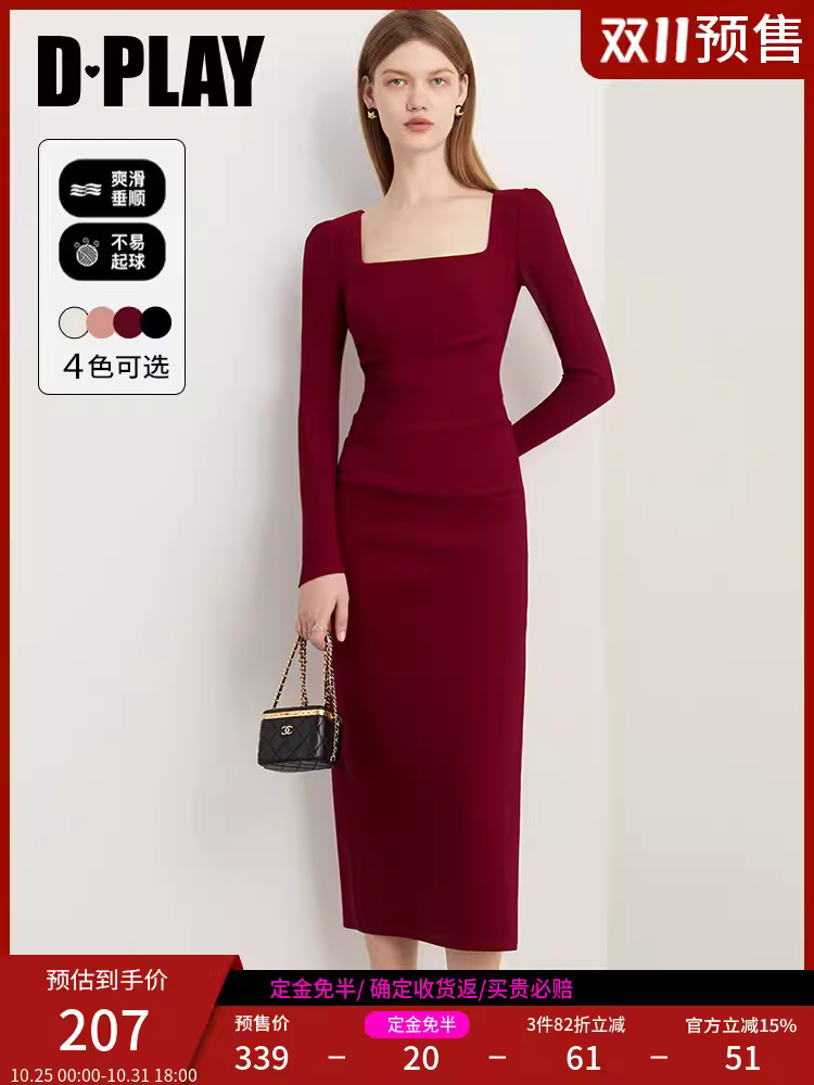 秋法式复古果酱红方领泡泡袖开衩裙订婚服敬酒服回门服