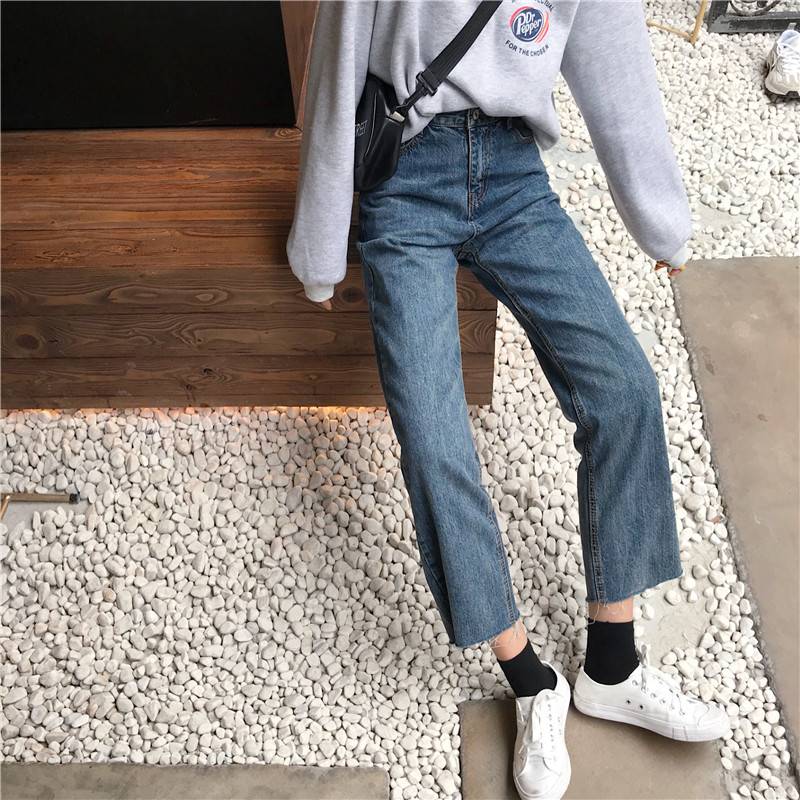 复古毛边裤脚直筒裤早春女2019新款韩版百搭宽松显瘦九分牛仔裤子