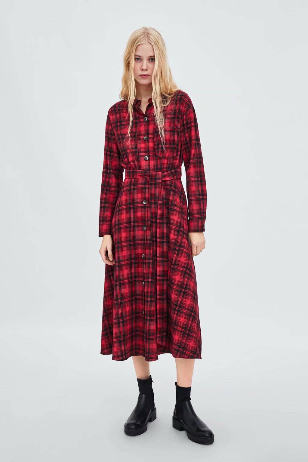 2018秋季新款 格子花呢女士长袖系带条纹连衣短裙