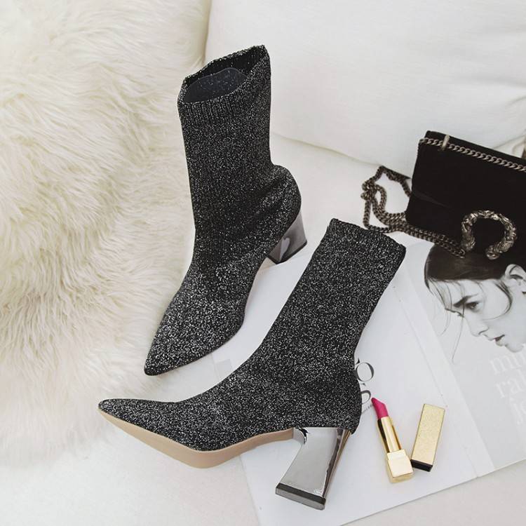 买一送一2018秋冬季新款里外真皮女鞋尖头细跟高跟鞋靴女金属电镀跟短靴女