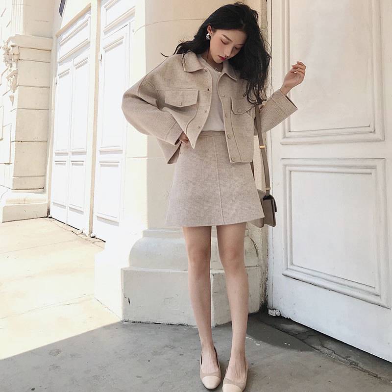 秋季时尚新款2018套装女装休闲网红小香风毛呢外套欧洲站两件套女