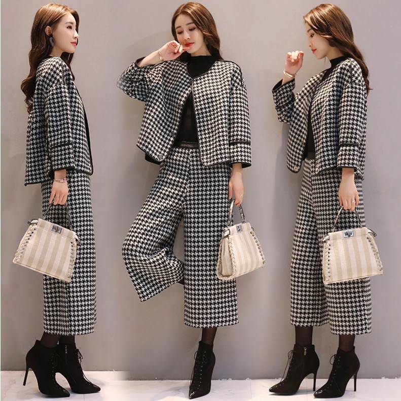 2018新款女装秋冬两件套毛呢外套短款阔腿裤休闲时尚套装女千鸟格