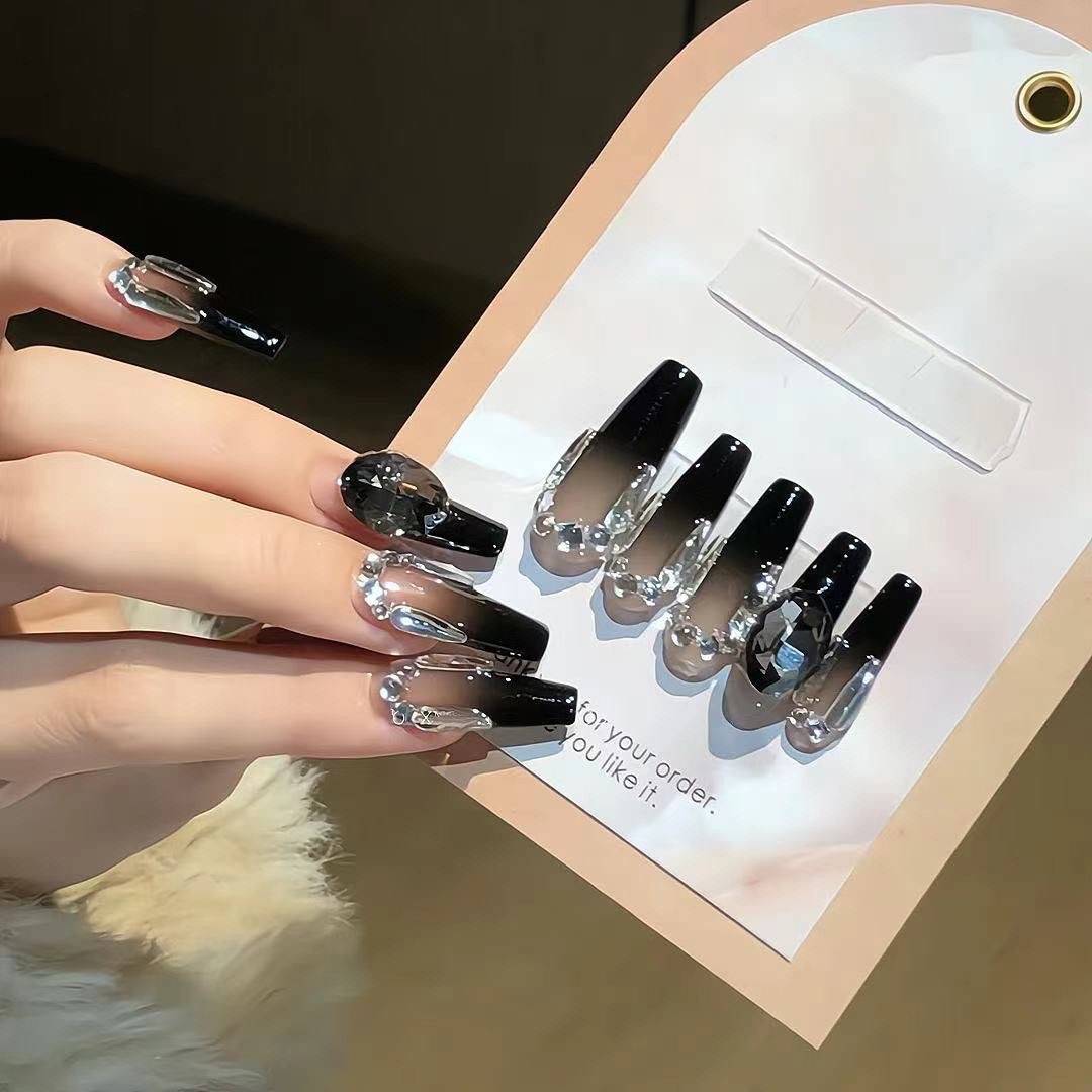 ins高级新款黑色渐变美甲穿戴纯手工甲片长款爆闪指甲贴片辣妹