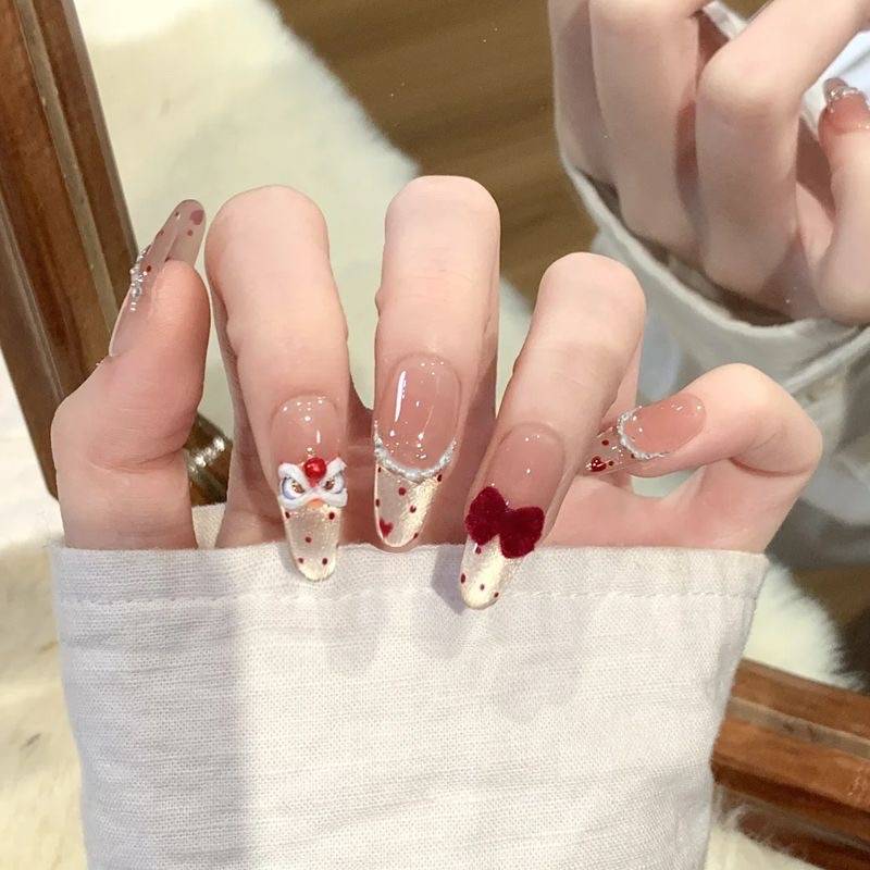 【新年醒狮】纯手工穿戴甲红色丝绒蝴蝶结法式波点珍珠贴钻美甲