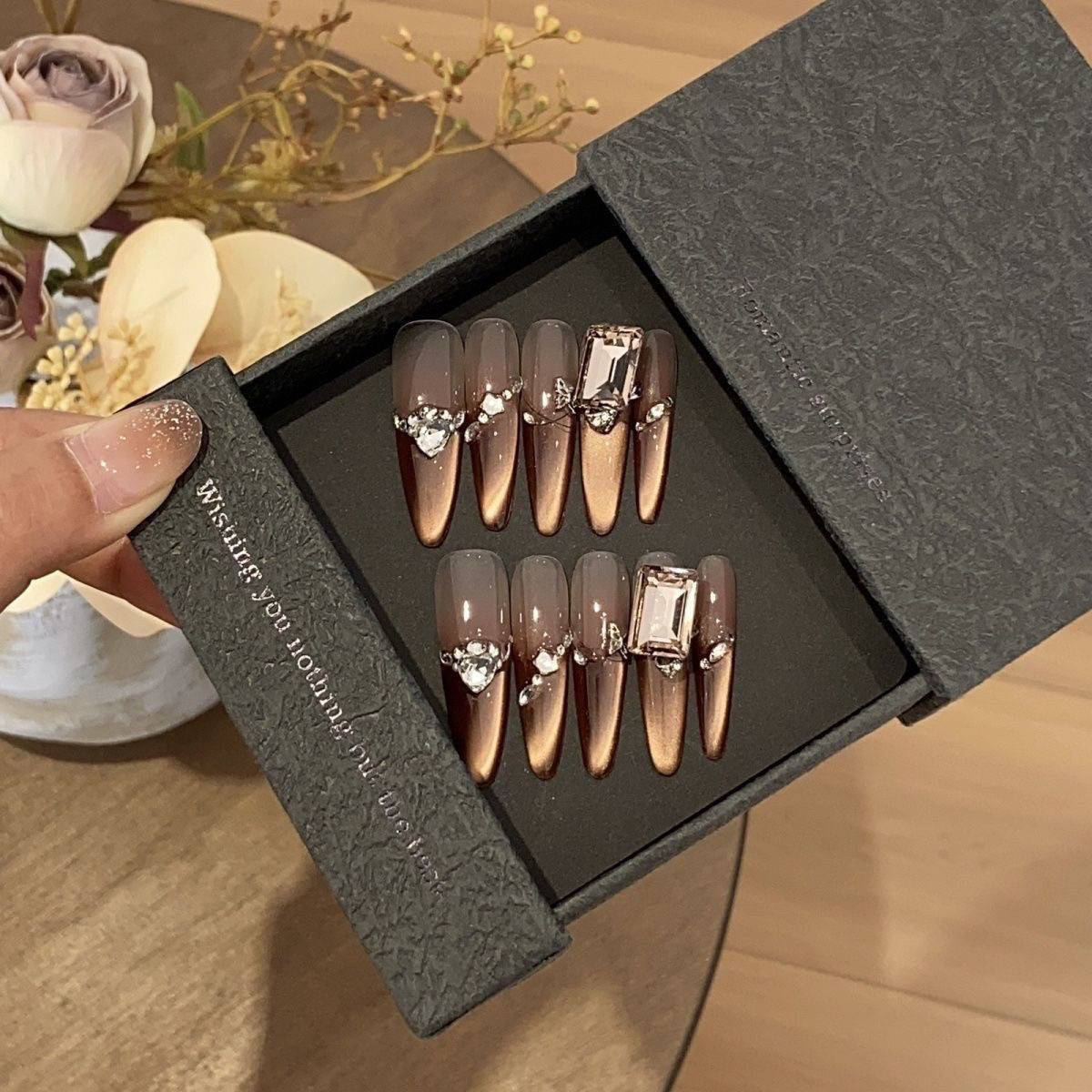纯手工美甲高级贵妇气质咖色方钻渐变斜边堆钻珠光宝气穿戴甲贴片
