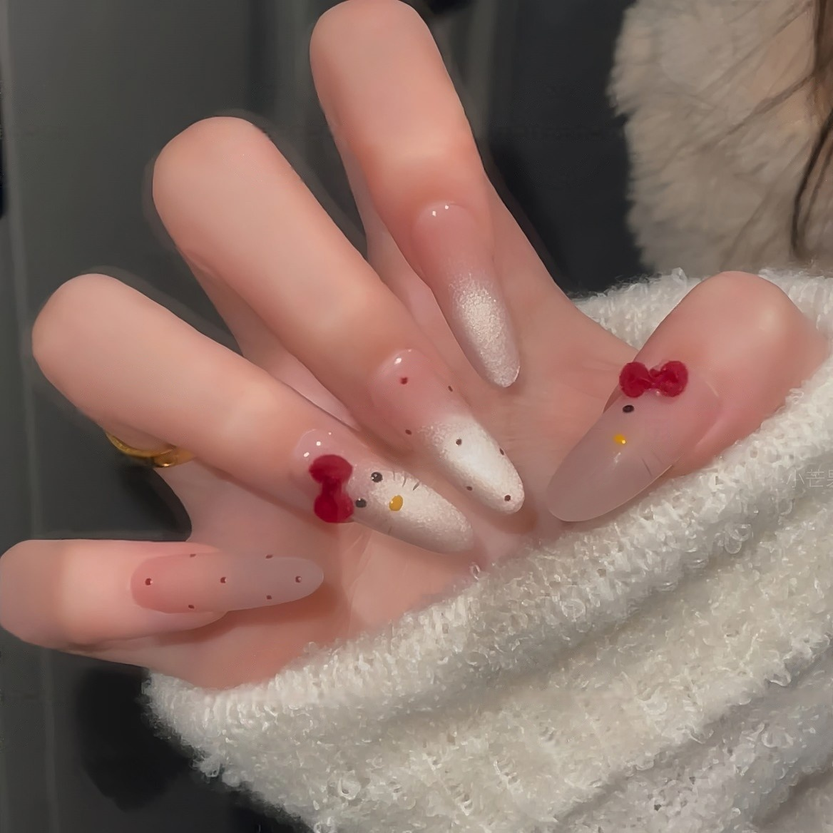 新年战甲丝绒KT猫纯手工穿戴甲波点凯蒂可爱猫眼显白手工美甲贴片